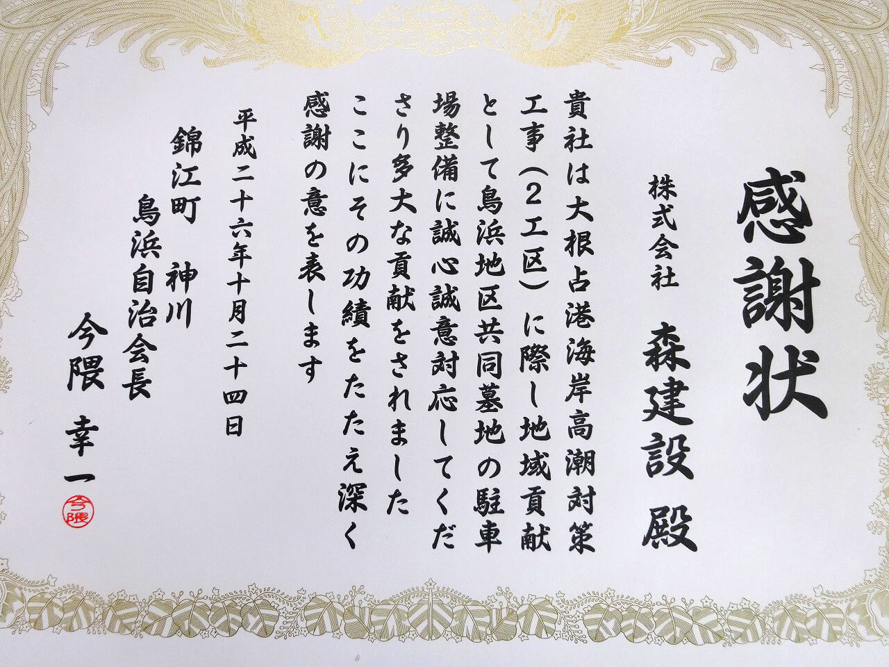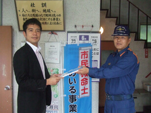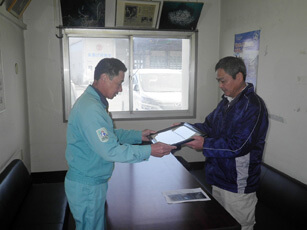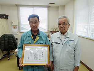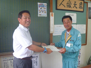 Certificate presenting ceremony was held at the company’s head office at 1 p.m. on Monday, June 25. Koichi Tokumaru, chief of Kihoku Branch of Fire Fighting Union of Osumi Kimotsuki area, conferred the certificate and banner. The company president, Yoshihiro Mori, attended the ceremony.