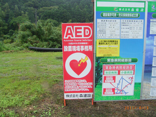This certification requires three or more trained members in one office. Its validity period is two years. Mori construction has made an effort to equip almost all construction sites of public facilities with AED (automated external defibrillator). We also display signs to tell neighbors and passers-by to use the AED in emergency.