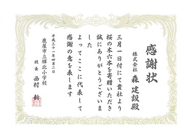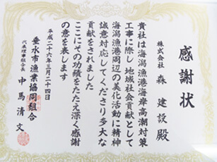 Osumi Regional Development Bureau recognized these activities and certified us as Hometown Road Supporter (10,000 meters of National Route 504) , Everybody’s Port Supporter (1,500 meters of Shibushi Port Seaside Road), and Hometown Erosion-control Supporter (designated erosion-control area of Kami-ichiki No. 4 brook).